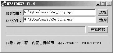 使用方法:MP3 to EXE的使用非常簡單,無需安裝直接運行軟件,在“MP3歌曲”欄定位要轉換的MP3文件,單擊“開始轉換”按鈕即可,如圖2所示。我們在雙擊播放生成的EXE文件時,系統會打開命令提示符窗口,輸入“1”回車可以循環播放該MP3,輸入“2”回車則為退出播放。
