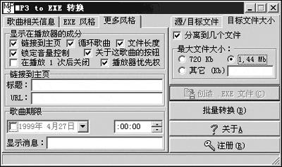 ,運行后可以在“歌曲相關信息”標簽中設置該MP3的文件名、標題、藝術家、專輯等信息,在“EXE風格”中設置生成EXE文件在播放時的背景色、默認音量等。為了方便使用軟盤攜帶,大家還可以在“目前文件大小”標簽中勾選“分離到幾個文件”,并在“最大文件大小”中勾選“1.44 MB”來分割輸出文件,如圖3所示。設置完畢在“源/目標文件”標簽中選擇MP3文件所在路徑EXE文件的輸出路徑,最后單擊“批量轉換”。