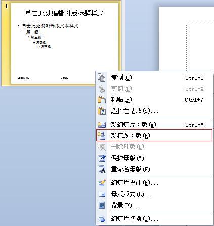 Step2:右側顯示出當前的母版樣式,要更改只需要選中這張幻燈片母版,右鍵選擇“新標題母版”。