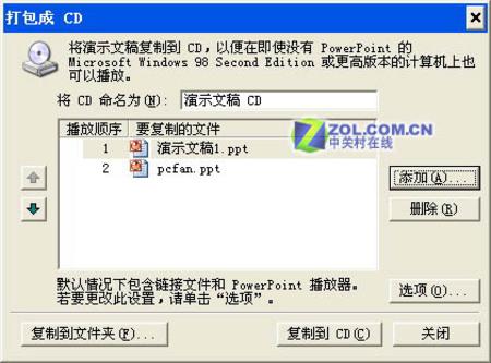 直接打包演示文稿到 CD 需要 Windows XP 或更高版本。如果是其他版本的Windows,可以先使用“打包成 CD”功能將演示文稿打包“復制到文件夾”,然后使用 CD 刻錄軟件將打包文件夾中的文件該錄到 CD 中。