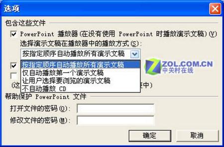 * 當設置“打包成 CD”的密碼時,那些密碼會應用于文件包中的 .ppt、.pot、.pps 和已經轉換為 .ppt 文件的PowerPoint .mht 文件,而不影響在原始文件上設置的密碼。