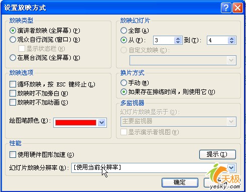 有時我們做好的幻燈片,在某次使用中突然中需要放映中間的某張到某張,而不是從第一張開始到最后一張結束。這時我們就要“放映方式”來解決這個問題。