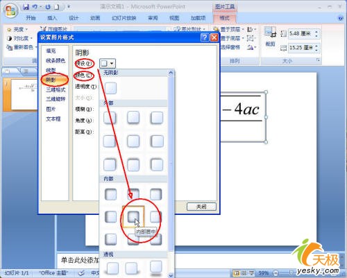 在“設置圖片格式”界面,點擊左側“陰影”欄,在右側“陰影”欄“預設”項點擊下拉箭頭號,在彈出的下拉陰影格式中點選“內部居中”格式。然后在“顏色”項點擊下接箭頭,如(圖五)