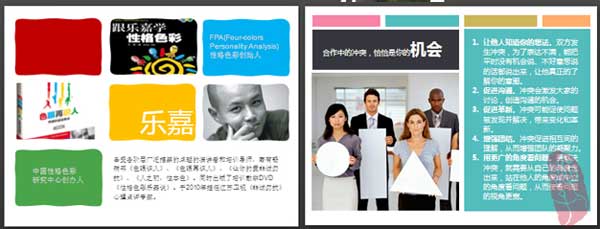 左圖:喜歡看《非誠勿擾》,樂嘉言語的犀利是節目的最大亮點,喜歡他的FPA樂嘉性格色彩,買了他的兩本書,正在學習。把頁面等分成9份,紅藍黃綠四色“性格“配以其中,其他以圖片填充。色塊和圖片的多少,隨你的喜好組合吧。