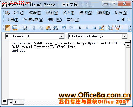 第三步:雙擊“打開網頁”按鈕,在打開的Visual Basic窗口的光標位置輸入如下代碼后關閉:WebBrowser1.Navigate(TextBox1.Text)(如圖3)。