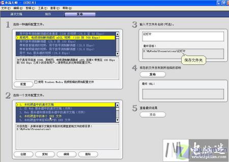 第四步:?jiǎn)螕羟袚Q到“發(fā)布”選項(xiàng)(如圖4),根據(jù)實(shí)際需要選擇一種編碼配置文件,然后選擇一種發(fā)布配置文件,要發(fā)布成網(wǎng)頁(yè)可選擇“僅在Web服務(wù)器中的演示文稿”,而打包成可執(zhí)行文件可選擇“本機(jī)硬盤中的單個(gè)EXE文件”;再輸入子文件夾名,即可發(fā)布在默認(rèn)目錄中的子文件夾中;最后單擊“發(fā)布”按鈕保存相應(yīng)格式的文件。