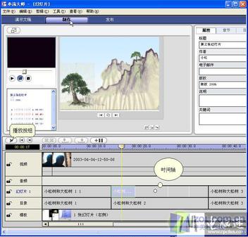 第三步:保存結(jié)束后返回主界面,單擊切換到“制作”選項(xiàng)(如圖3),在“屬性”中輸入幻燈片的標(biāo)題、作者等信息;“時(shí)間軸”上的“目錄”是單張幻燈片的名稱,“幻燈片1”以幻燈片中的動(dòng)作為依據(jù),分成若干部分排列在時(shí)間軸上;“視頻”軌道上是幻燈片對(duì)應(yīng)的真人講解視頻;選擇菜單“編輯/背景聲音”可以導(dǎo)入歌曲作為幻燈片的背景音樂,并且可以調(diào)節(jié)背景音樂的音量;最后單擊“播放”按鈕觀看幻燈片的效果。