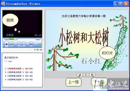 第五步:創(chuàng)建完成后會(huì)詢問是否觀看發(fā)布的內(nèi)容,左側(cè)是視頻和幻燈片標(biāo)題,右側(cè)是顯示幻燈片的內(nèi)容(如圖5),單擊“上一張”或“下一張”按鈕,視頻會(huì)隨著幻燈片的切換而切換,兩者之間是同步的;單擊“幻燈片”的標(biāo)題也可以觀看相應(yīng)的幻燈片及真人視頻講解;如果發(fā)布成網(wǎng)頁(yè)格式,整體界面也如圖5所示,只是文件格式不同而已。