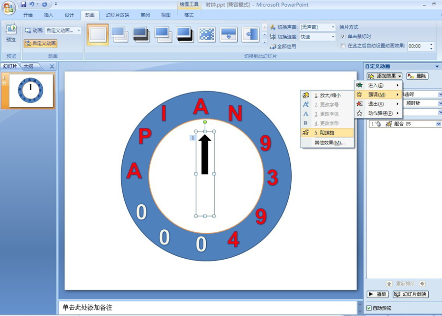 6、選中時針,選擇“自定義動畫”,添加“動作效果”為:強調-->陀螺旋。