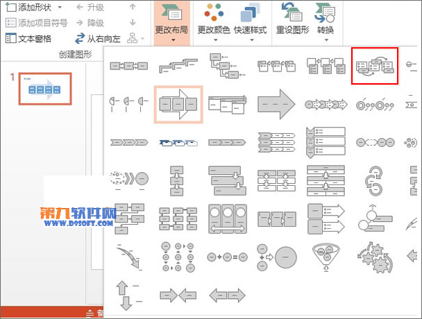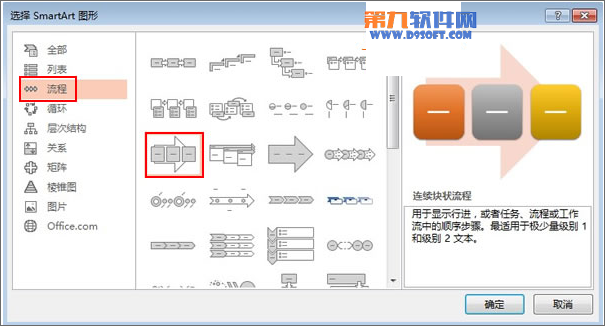 2、然后點擊插入SmartArt圖形按鈕,彈出對話框,選取流程中的第三排第一種樣式。