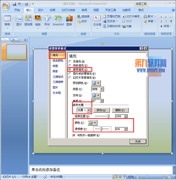 3、在“設置形狀格式”對話框中,將選項卡切換到“填充”,點選“漸變填充”,在“漸變光圈”下拉列表中選擇“光圈1”,還可以根據需要對“結束位置”進行調整。在“顏色”的下拉列表中可以選擇一種喜歡的顏色,然后設置顏色的“透明度”。