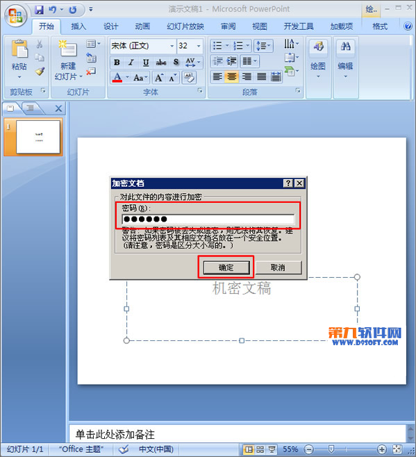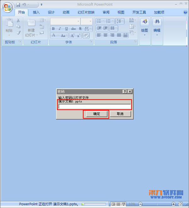 4、關閉該演示文稿,當我們重新打開演示文稿時,會彈出“密碼”對話框,這時需要輸入剛剛設置的密碼,點擊“確定”按鈕,才能打開該演示文稿。