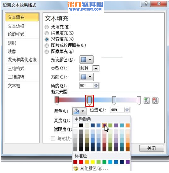 ②彈出設(shè)置文本效果格式對(duì)話(huà)框,在文本填充中勾選漸變填充,預(yù)設(shè)顏色選為雨后天晴這款樣式,如下所示。