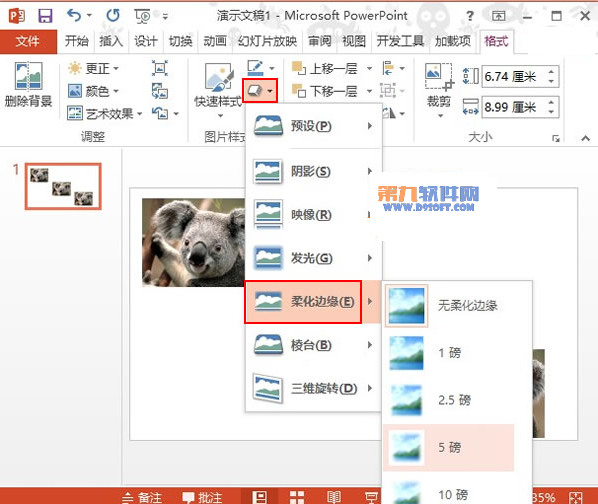 3、圖片插入之后,拖動邊緣的小圓圈,調整圖片大小,擺放好位置,這里小編復制3個,好給大家做對比。選中其中一張,單擊格式選項卡下圖片處理按鈕,選擇柔化邊緣,設定一個磅值。