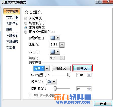 第二步:彈出設(shè)置文本效果格式對(duì)話框,在文本填充中勾選漸變填充,類型選擇射線,方向中心輻射,設(shè)定光圈1結(jié)束位置60,透明度100。
