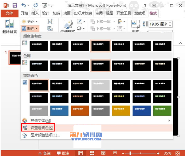 7、這樣就將其轉變為了圖片格式,選中,在格式選項卡下單擊顏色按鈕,設置透明色。