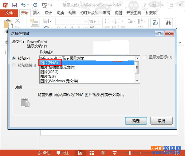 6、點擊粘貼按鈕,選擇性粘貼,雙擊圖片(PNG),確定。