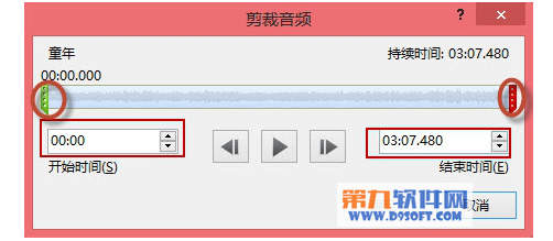 打開“剪裁音頻”對話框,可以拖動下圖圓圈所示的開始和結束柄來剪裁音頻,然后單擊“確定”即可完成音頻的剪裁。