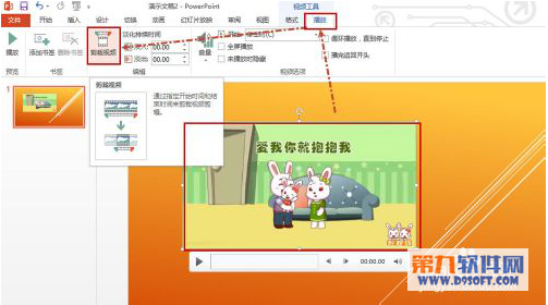 3、選中視頻,這時候上面就會顯示“視頻工具”(包括“格式”和“播放”選項卡),單擊“播放”選項卡,然后單擊“剪裁視頻”。