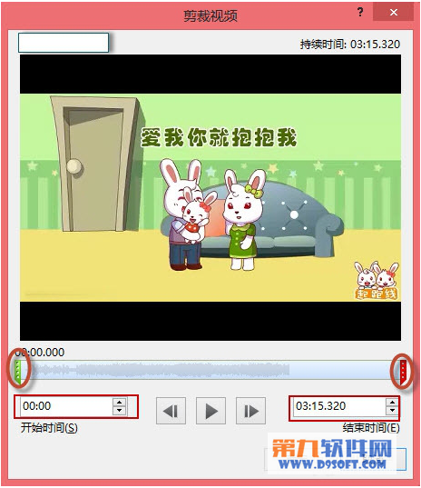 4、開“剪裁視頻”對話框,可以拖動下圖圓圈所示的開始和結束柄來剪裁視頻,然后單擊“確定”即可完成視頻的剪裁。