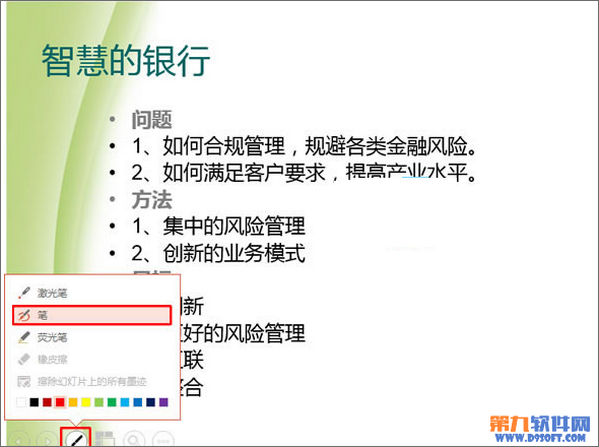 其實PowerPoint2013中在播放幻燈片時有“指針選項”按鈕,大家單擊它即可選擇自己需要的指針類型以及指針顏色 。然后執行方法一中的步驟2即可。