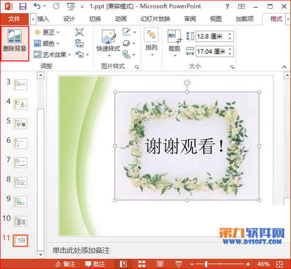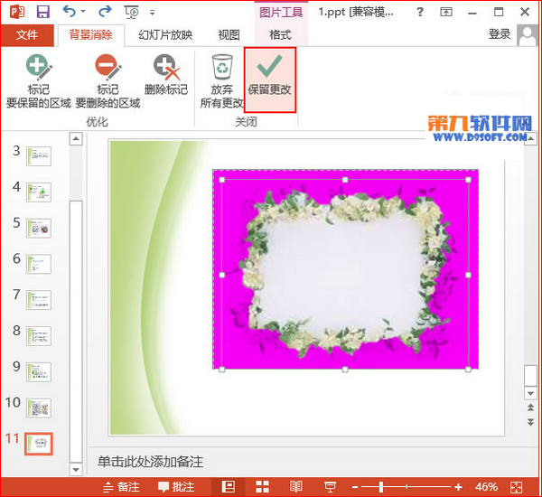 6、現在PPT會自動切換到“圖片工具->背景消除”選項卡,并且圖片背景變為桃紅色,我們可以拖動圖片周圍的控點來調整圖片背景的刪除范圍,待調整好后單擊“保留更改”按鈕。
