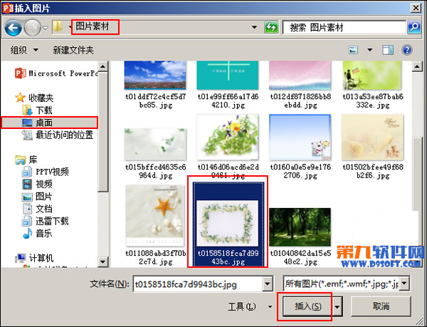 2、此時會彈出一個“插入圖片”的對話框,我們選擇自己需要插入的圖片,并單擊“插入”按鈕。例如,我們現在選擇“桌面”上“圖片素材”文件夾里名為“t0158518fca7d9943bc.jpg”的圖片,然后單擊“插入”按鈕。