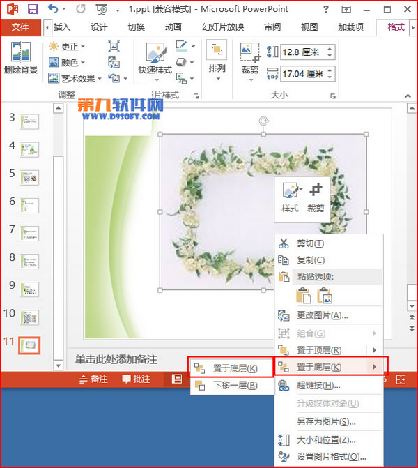4、調整好圖片的大小以及位置后,我們選中圖片,單擊鼠標右鍵,在彈出的快捷菜單中選擇“置于底層”選項組的“置于底層”。