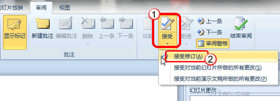 或者,當您打開原來舊的演示文稿之后,如下圖,點擊“接受”,再點擊“接受修訂”。