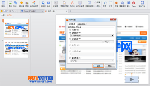 3、畫好后釋放鼠標,會彈出一個“操作設置”對話框,我們可以根據自己的需要設置“單擊鼠標”和“鼠標懸停”選項卡中的內容,比如,我們現在默認為“超鏈接到最后一張幻燈片”,設置完成后單擊“確定”按鈕。