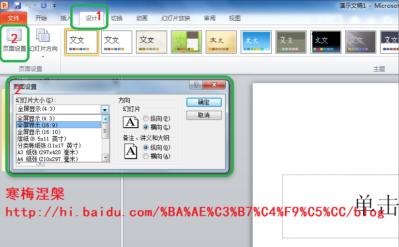 ②在彈出的“頁面設(shè)置”下面的“幻燈片大小”下拉菜單中找到“全屏顯示(16:9)”或者“全屏顯示(16:10)”后者是寬屏筆記本常見的縱橫比。一般常見的就這兩種顯示比例設(shè)置了,調(diào)整完畢后單擊確定就可以了。