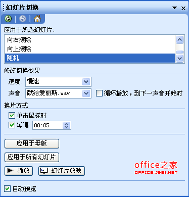 3)在任務(wù)窗格的“幻燈片切換”選項卡,“聲音”下拉式列表框中,就出現(xiàn)“獻(xiàn)給愛麗斯.wav”。聲音文件獻(xiàn)給愛麗斯.wav即嵌入該幻燈片中。