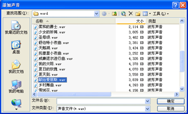 2)在“添加聲音”對話框上,選中需嵌入的聲音文件(如圖2所示,“獻(xiàn)給愛麗斯.wav”,3839KB),然后單擊“確定”。