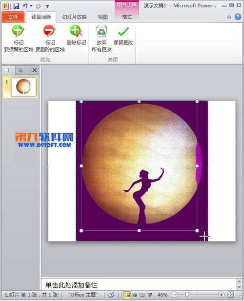 2、演示文稿切換到【背景消除】選項卡。如圖紫色區域是要被刪除的部分。我們先拖動選框四角,將月亮部分框選在保留區域內。