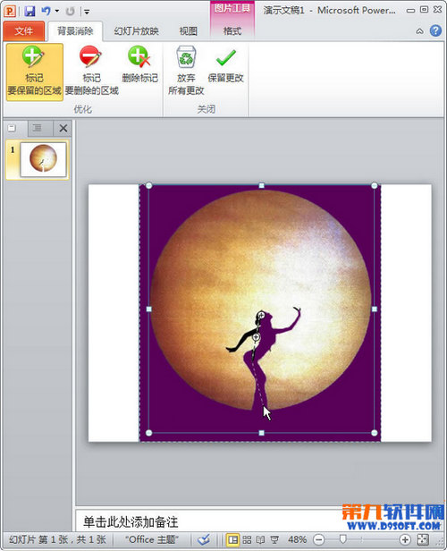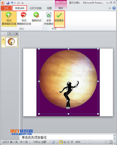 4、單擊【背景消除】選項卡下的【保留更改】。看看,是不是保留了我們想要的月亮和人形剪影。
