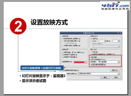 之后還需要在PowrPoint軟件下進行設置,主要是兩點,將幻燈片放映顯示于投影屏幕(監視器2);勾選“顯示演示者視圖”