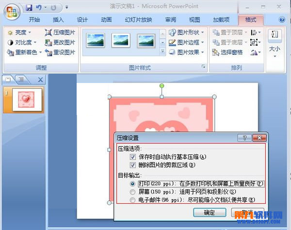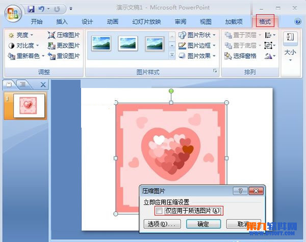 彈出壓縮圖片對(duì)話框,根據(jù)情況勾選“僅用于所選圖片”,然后點(diǎn)擊“選項(xiàng)”按鈕。