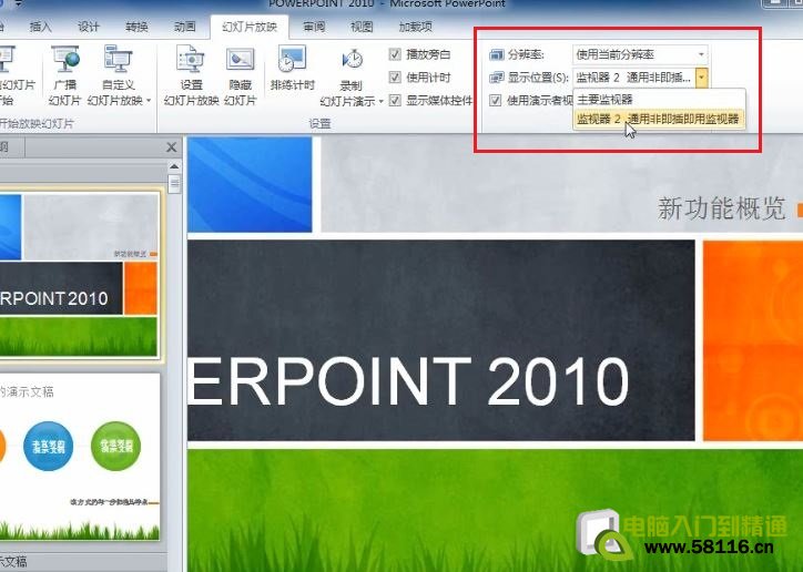 1. 打開 PowerPoint 2010,點擊“幻燈片放映”選項卡,在“監視器”選項組中有一個“使用演示者視圖”選項,該選項的作用就是將全屏的幻燈片投射到大屏幕上,而我的計算機不僅能看到幻燈片還能看到備注和計時的信息;