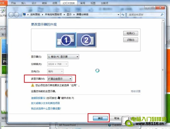 3. 目前已經將計算機連接好了投影儀,可以看到已經出現了兩個監視器,在“顯示器選擇”中選擇“擴展這些顯示”,然后單擊“確定”按鈕;