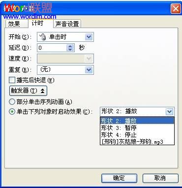 在彈出的“播放聲音”對話框中,點“計時”標簽,然后點“觸發器”,選中“單擊下列對象時啟動效果”,并點其后的小三角,在彈出的對話框中選擇“播放”最后點“確定”,聲音播放設置完畢。