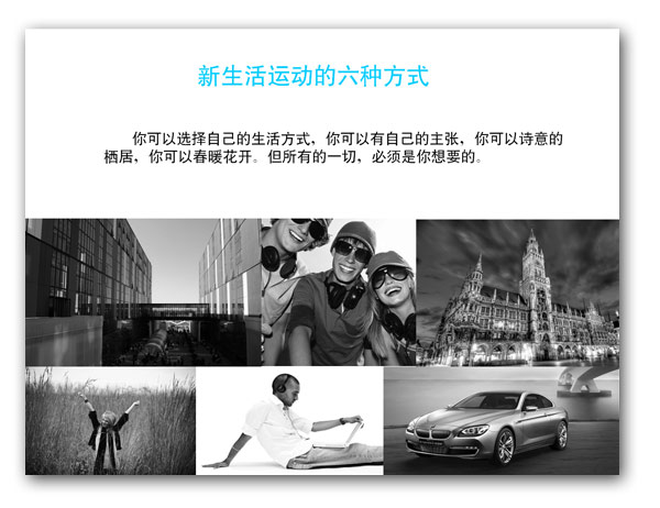 黑與白,在PPT版式設計 中是個詭異的組合。遠離錯綜復雜的花哨,卻始終經典;即便缺少紛繁耀目的裝飾,依然傲視群芳。這,就是PPT版式設計 中黑與白的力量。簡約干練得足以在時尚的輪回中笑看風云。