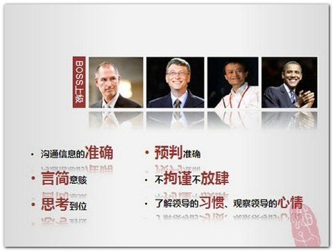 下面是面包的PPT作品《溝通的魅力》中的頁面,看似簡單的設(shè)計卻很有韻味,和上司溝通的技巧因為坐落有致的排版而簡單明了。如果你喜歡面包這個PPT設(shè)計,猛擊下載。