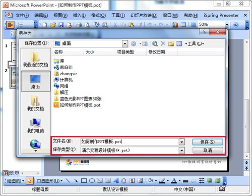 各位帥哥美女們注意啦,這一步是非常非常重要的!許多朋友設計好了之后是直接點保存的,但這是錯誤的,這樣保存下來的文件不是PPT模板文件。正確的方法是: 在菜單欄,選中“文件”–“另存為” ,在打開的界面中進行如下設置:保存位置,可以放在桌面,“文件名”在這里暫定義為“如何制作PPT模板.ppt”。“保存類型”請選擇“演示文稿設計模板”,然后點保存。接下來你可以返回到桌面看一下這個文件的圖標和擴展名,發現了嗎? 它的圖標跟一般PPT的圖標是不一樣的,同時它的文件和擴展名是“如何制作PPT模板.pot”