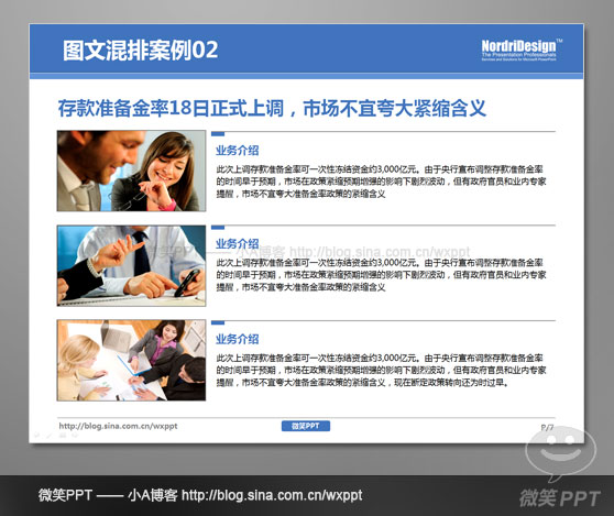 如同案例1,作者犯了同1個錯誤,PPT中圖片的放置過于隨意性,不均衡的大小與交錯的位置顯得頁面零散,從而降低專業(yè)性,使圖片美化頁面的效果大打折扣。