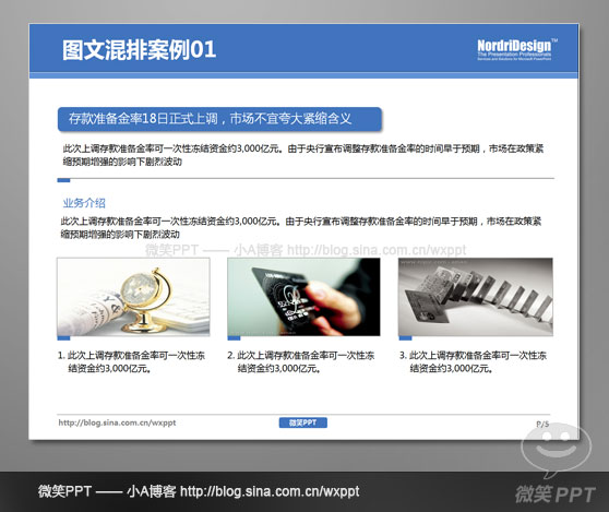 頁面保留了商務ppt的特性,規(guī)規(guī)矩矩。3張圖分別對應圖上3條內(nèi)容信息。但PPT排版的問題,使得圖片與內(nèi)容缺乏呼應,頁面大有“為了放圖而放圖”的感覺,缺乏指向性。