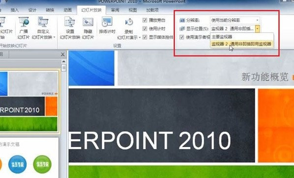 步驟一:打開powerpoint 2010,點(diǎn)擊“幻燈片放映”選項(xiàng)卡,在“監(jiān)視器”選項(xiàng)組中有一個“使用演示者視圖”選項(xiàng),該選項(xiàng)的作用就是將全屏的幻燈片投射到大屏幕上,而我的計算機(jī)不僅能看到幻燈片還能看到備注和計時的信息。
