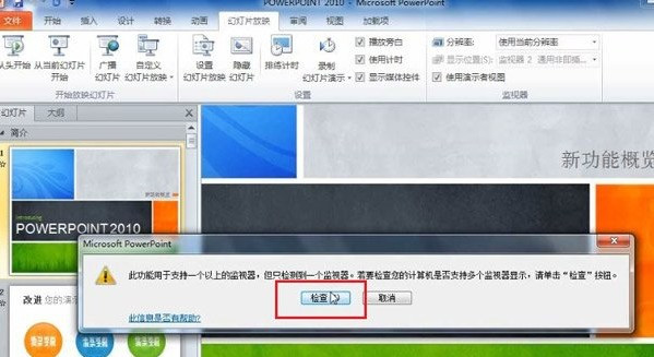 步驟二:點(diǎn)擊“使用演示者視圖”,此時會出現(xiàn)一個警告信息,該選項(xiàng)實(shí)際上告訴我們當(dāng)前的計算機(jī)只檢測到了一個監(jiān)視器,而我們要“使用演示者視圖”的話必須有兩個或兩個以上的監(jiān)視器,請確認(rèn)自己的計算機(jī)已經(jīng)連好了投影儀或者已經(jīng)連接了其他的監(jiān)視器,現(xiàn)在點(diǎn)擊“檢查”按鈕。