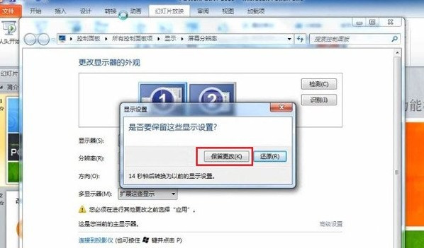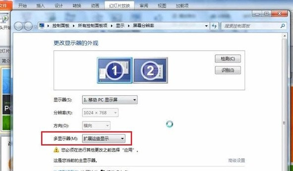 步驟三:目前已經(jīng)將計算機(jī)連接好了投影儀,可以看到已經(jīng)出現(xiàn)了兩個監(jiān)視器,在“顯示器選擇”中選擇“擴(kuò)展這些顯示”,然后單擊“確定”按鈕。