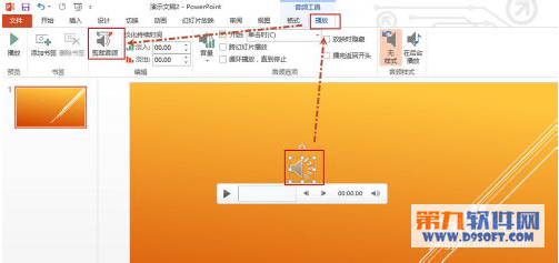 剪裁音頻的方法和視頻類似。選中音頻,這時候上面就會顯示“音頻工具”(包括“格式”和“播放”選項卡),單擊“播放”選項卡,然后單擊“剪裁音頻”。