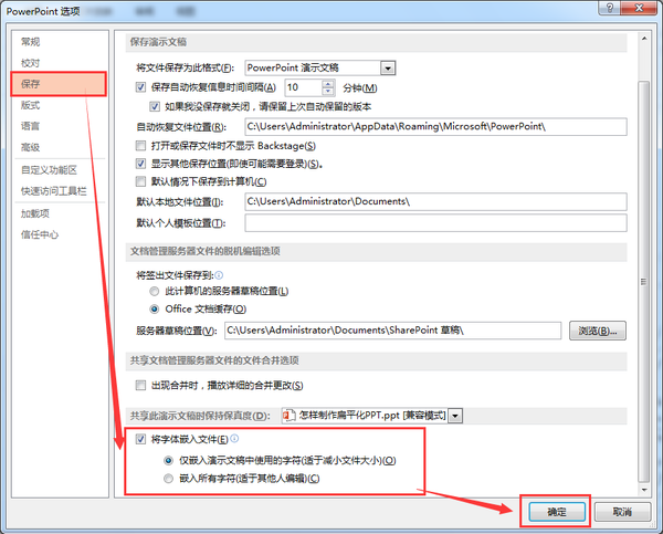 第三步:點(diǎn)擊“保存”→“將字體嵌入文件”這個(gè)選項(xiàng)打√→選擇嵌入的方式→點(diǎn)擊“確定”,如下圖: